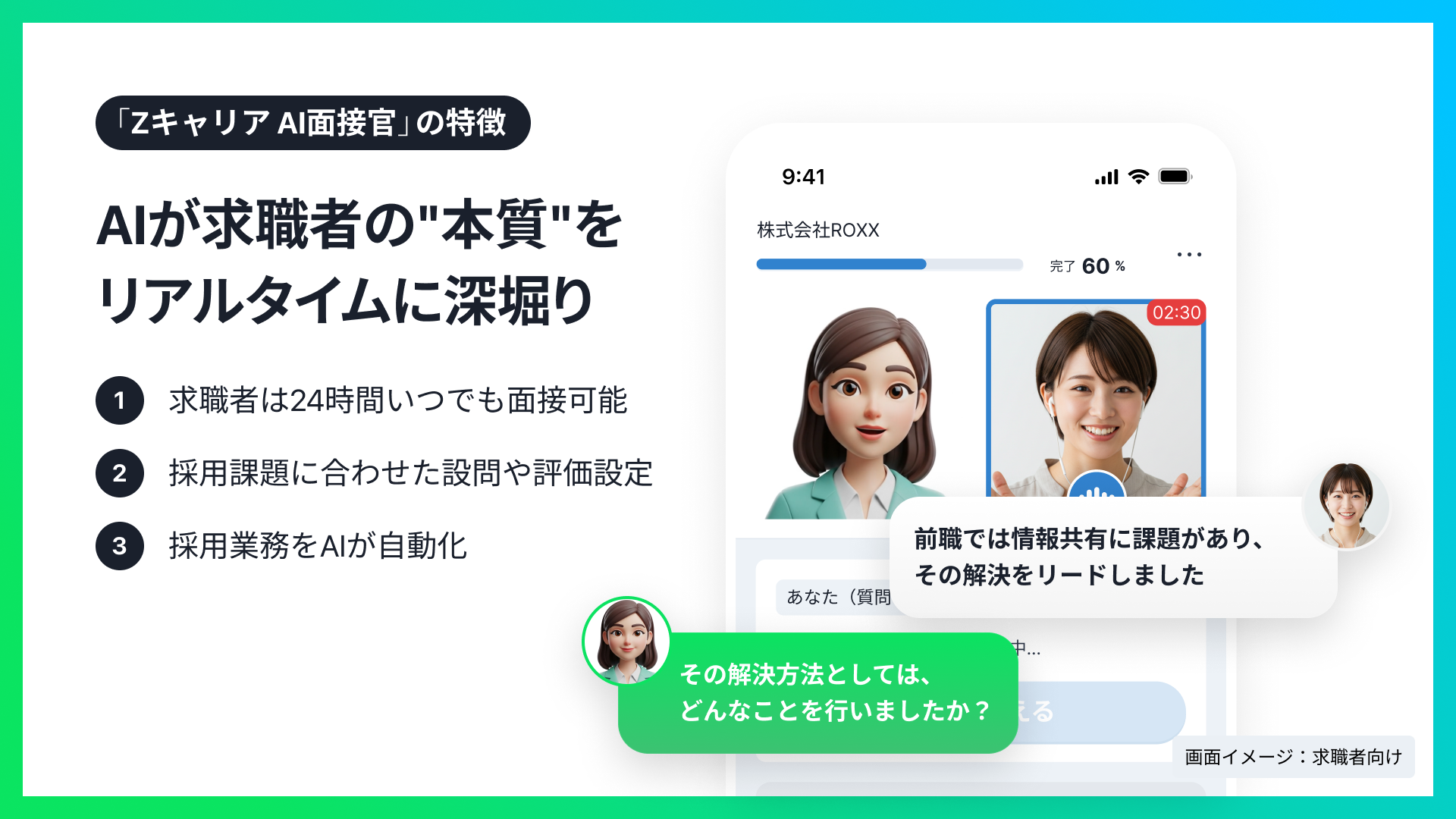 『Zキャリア AI面接官』は、採用面接の一部をAIによって代替し、面接工数の削減や選考リードタイムを実現する採用支援サービスです。求職者は24時間365日、スマートフォンひとつでいつでも面接に臨むことができ、採用企業側は、夜間や休日を含む柔軟な選考体制の構築が可能となります。加えて、書類選考だけでは見極めが難しい求職者のポテンシャルも事前スクリーニングにより可視化され、採用におけるミスマッチの削減にも寄与します。