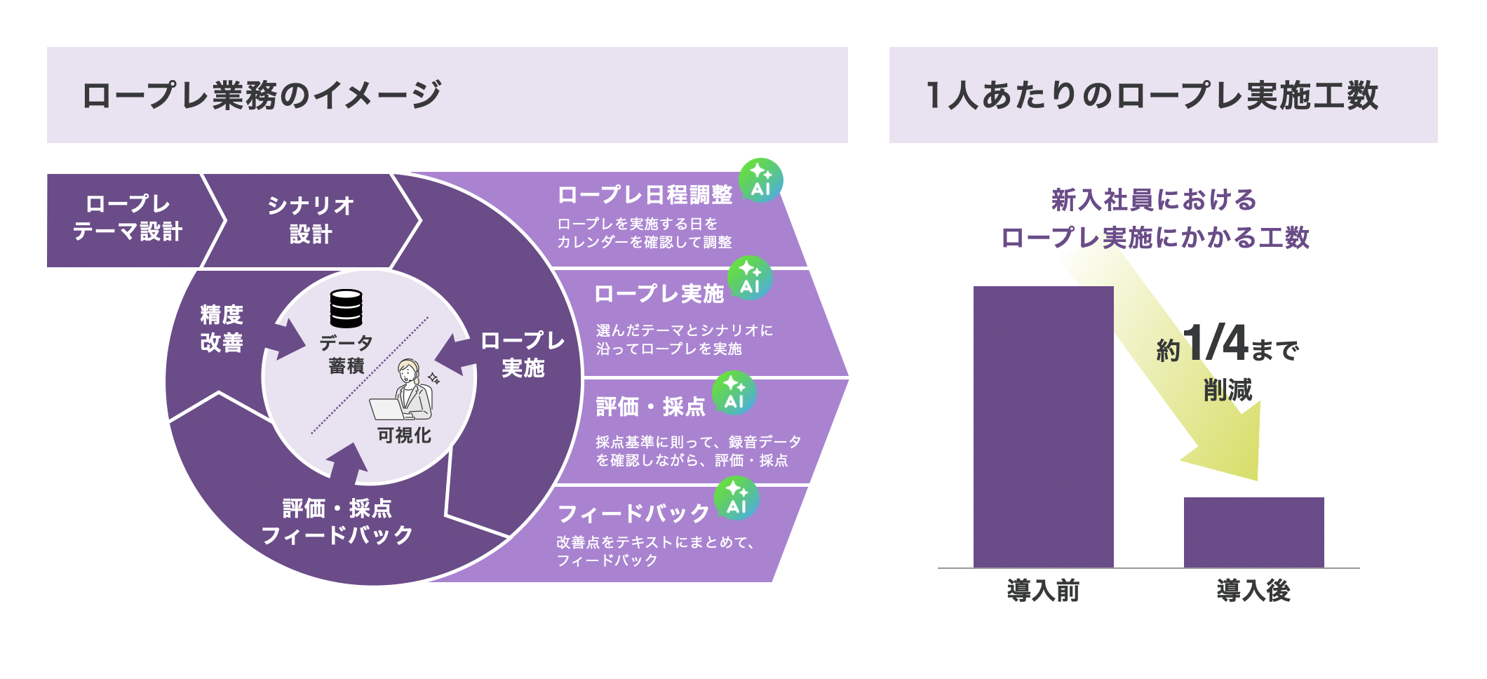 本システムの導入により、従来の対人によるロープレにおいてボトルネックとなっていた「日程調整」や「評価者の確保」をはじめとした課題を解消し、マネージャーの負荷を軽減はもちろんのこと、CAが場所や時間を選ばず、いつでも反復練習を実施することが可能になります。