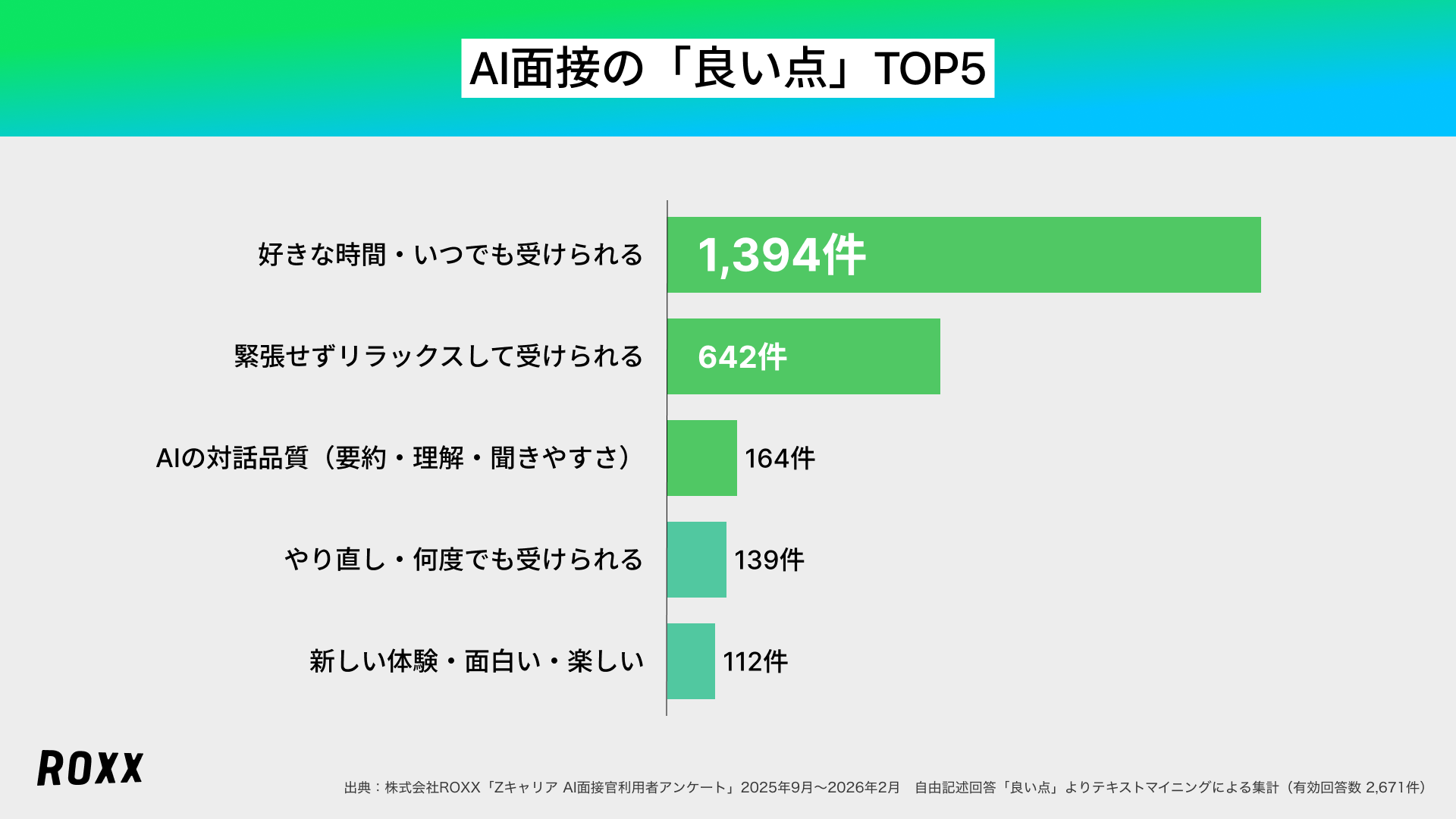 自由回答で「良い点」として寄せられた2,671件のうち、最多は「時間・場所の柔軟性」(1,394件)でした。「場所を選ばない利便性」(82件)や「手軽さ・スムーズな進行」(88件)といった関連カテゴリも一定の支持を得ており、24時間365日・場所を問わずスマートフォンひとつで選考を完了できるという利便性が、AI面接の土台となる価値であることが裏付けられました。