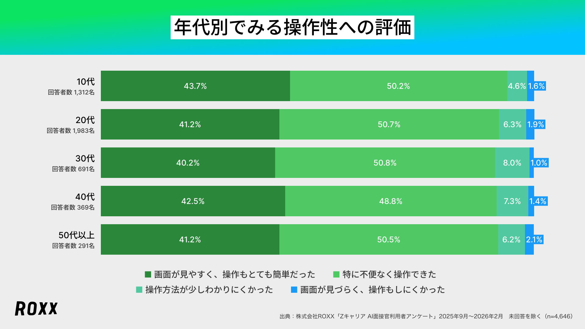 操作性や安定性に関する質問では、全年齢層で90%以上が操作性に問題なしと回答し、直感的なUIがITリテラシーの差を問わず公正な選考機会の提供に寄与していることが確認されました。