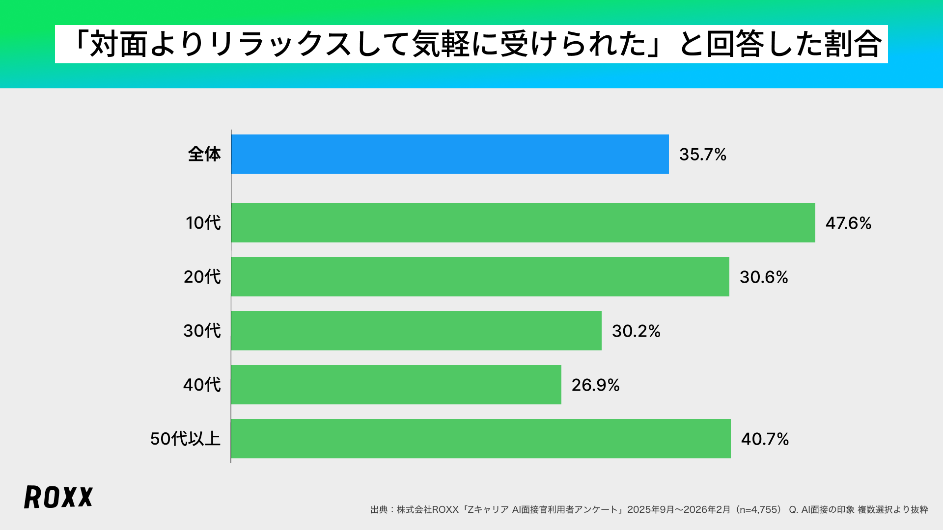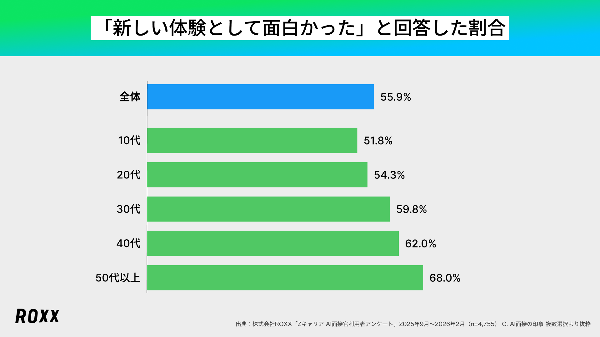 さらに、40〜50代以上では「新しい体験・先進性」の評価が若年層を上回っており、長年にわたり対人面接を経験してきた世代ほど、AI面接を新鮮な体験としてポジティブに受け止めていることが示されました。