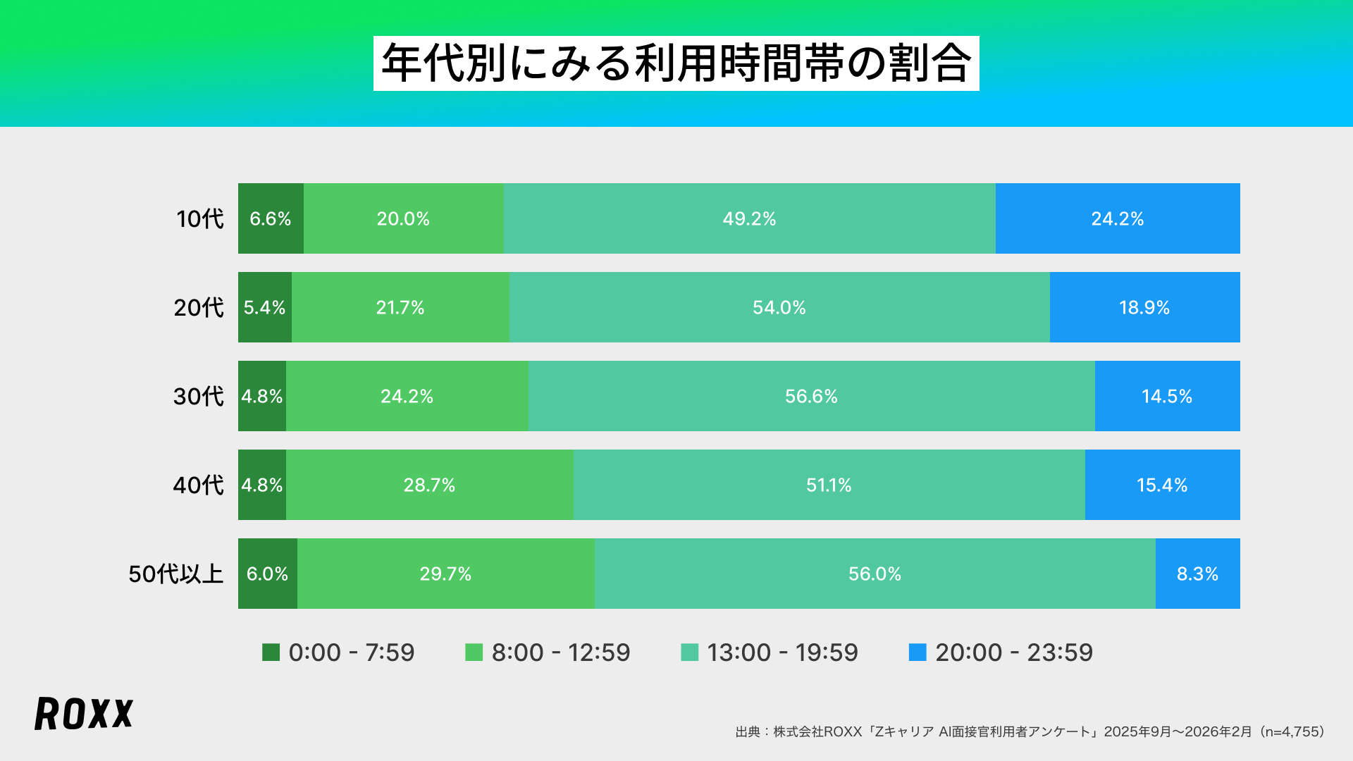 年代別の傾向では、10代において夜間・早朝(20時〜翌8時)の利用が30.8%と全体平均を大きく上回りました。一方、年齢層が上がるにつれて午前中の利用率が高まる傾向も見受けられ、AI面接が各世代の生活リズムに合わせて柔軟に利用されていることがうかがえます。