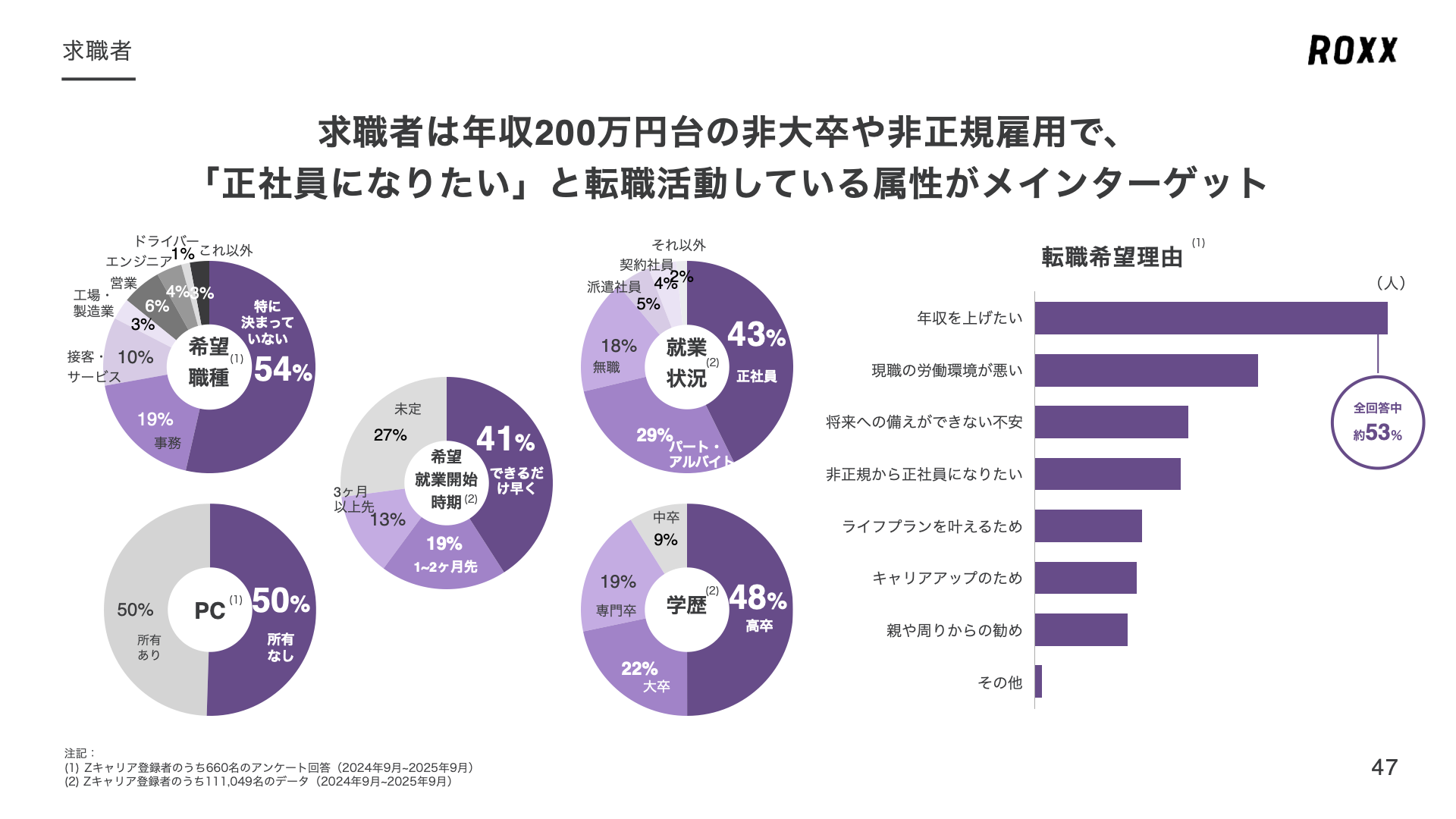 『Zキャリア』は、未経験から正社員を目指すノンデスク領域に特化した転職プラットフォームです。少子高齢化を背景に人材不足が進み、人材獲得競争のさらなる加速が見込まれるなか、日本の給与所得者の半数以上は年収400万円未満(※1)、非大卒は67%(※2)、非正規率も37%(※2)に上ります。一方で、国内人材紹介市場において、その多くが学歴や職歴を持った即戦力の求職者を対象としたサービスとなっています。ROXXではこうした業界構造に着目し、未経験の求職者と採用企業のマッチングサービスに加えて、パートナーである人材紹介会社の支援サービスを展開しています。幅広い業界および職種における求職者と採用企業とのマッチングを創出しています。